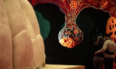 Titelbild: Installationsansicht In aller Munde. Von Pieter Bruegel bis Cindy Sherman Im Hintergrund: Piotr Uklański, Untitled (Open Wide), 2012 © Piotr Uklański, Courtesy der Künstler und Gagosian.